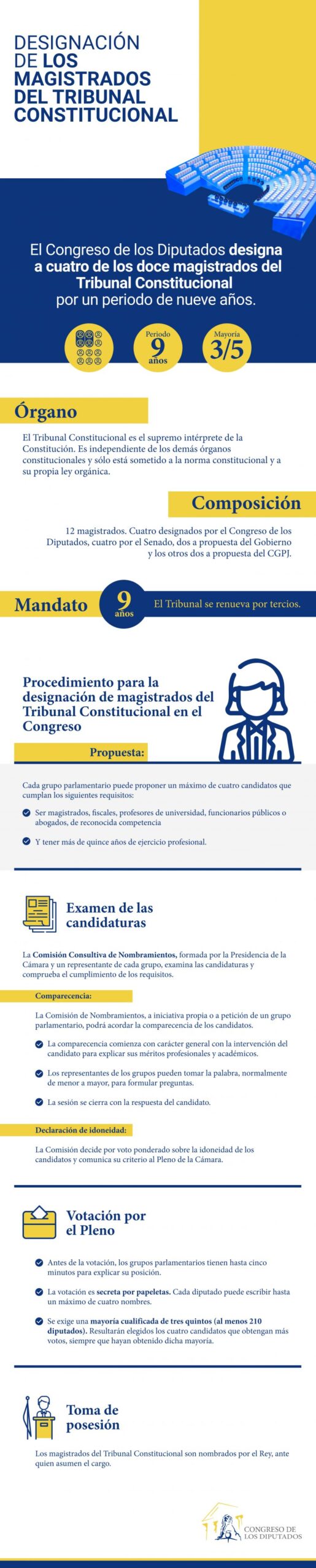 El proceso para la designación de los doce magistrados del Tribunal Constitucional contempla que cuatro sean elegidos por el Congreso, otros cuatro por el Senado, dos por el Gobierno y dos por el Consejo General del Poder Judicial. Los mandatos duran nueve años y se renueva un tercio cada tres años.