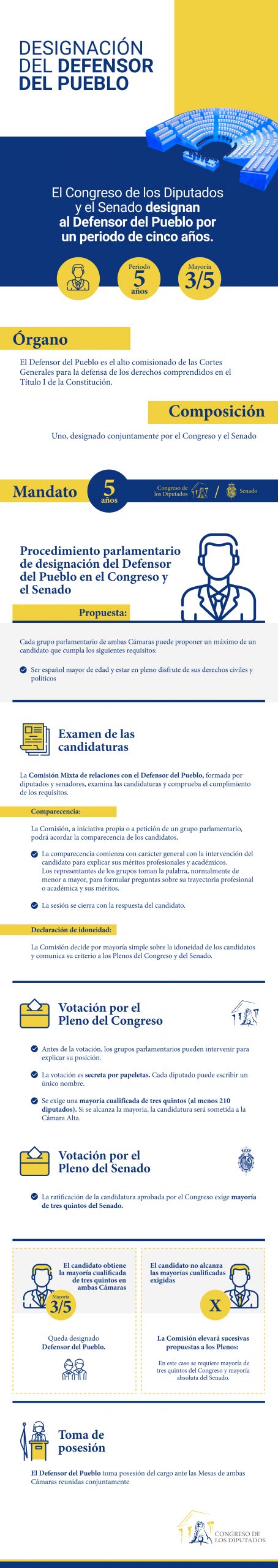 El Defensor del Pueblo es elegido por las Cortes Generales —Congreso y Senado— para un mandato de cinco años, mediante un proceso que exige una mayoría cualificada. Este nombramiento conjunto garantiza la independencia y el consenso institucional necesarios para desempeñar su función: la defensa de los derechos fundamentales y las libertades públicas de la ciudadanía. La elección está regulada por la Ley Orgánica 3/1981, que también establece sus competencias, su relación con las administraciones públicas y su obligación de rendir cuentas ante el Parlamento.